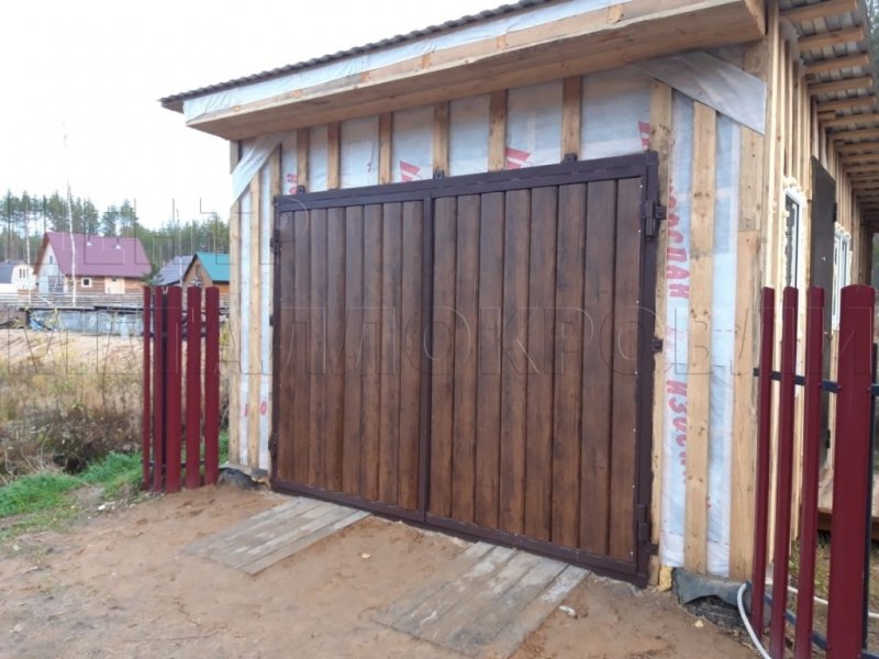 Ворота для гаража из металлосайдинга могут быть как распашными, так и откатными, и даже с автоматизированным приводом. Всё зависит от ваших предпочтений, это касается также ширины и высоты конструкции.