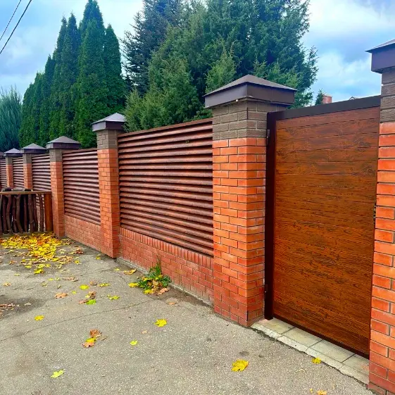 Секция забора жалюзи из ламелей еврожалюзи Темный Дуб 3D Принтек с кирпичными столбами анфас двусторонний